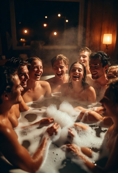 “มาช่วยถูหน่อยสิ” แพรหันไปยิ้มให้ “ไทน์” หนุ่มหล่อประจำแก๊ง ไทน์ไม่รอช้า เดินเข้าไปโอบเอวแพรจากด้านหลัง มือลื่นไปกับฟองสบู่ เริ่มจากไหล่ → หลัง → เอว → ลงต่ำลงไปเรื่อย ๆ แพรแค่หลับตาพริ้ม ยกแขนโอบคอไทน์ไว้